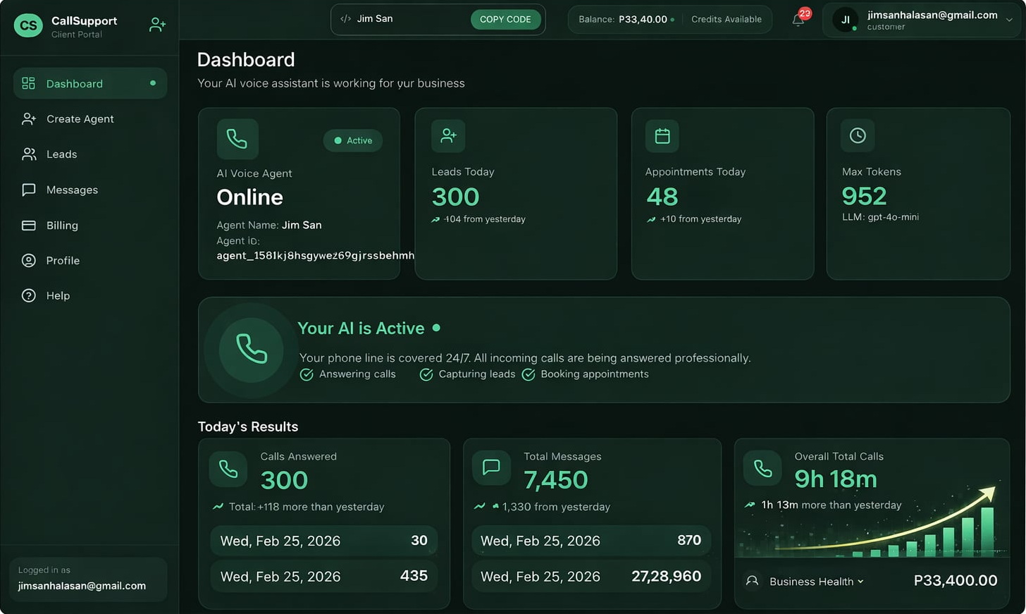 ✅ Ang dashboard ang ginagamit ng businesses upang i-manage ang kanilang CallSupport™ voice assistant.
